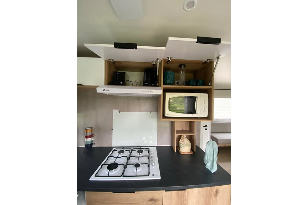 - Cuisine comprenant réfrigérateur, micro-ondes, cafetière électrique, plaques de cuisson gaz, vaisselle et ustensiles de ménage